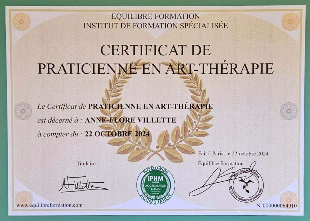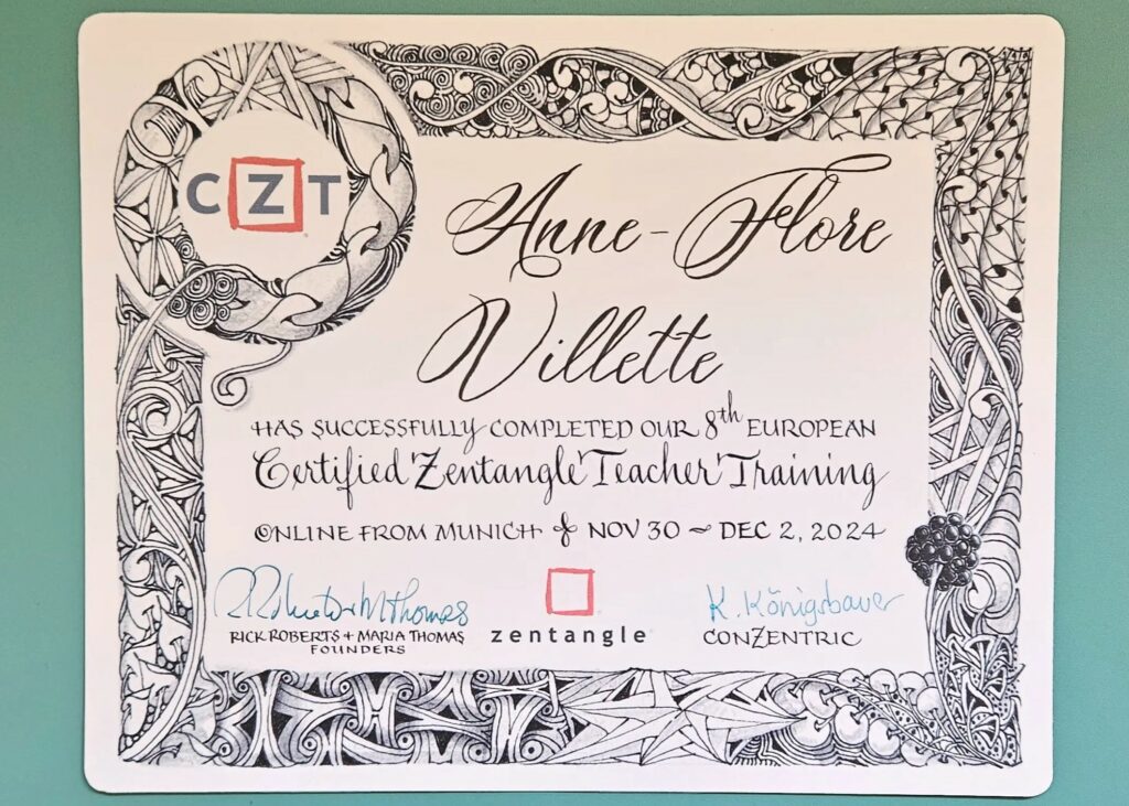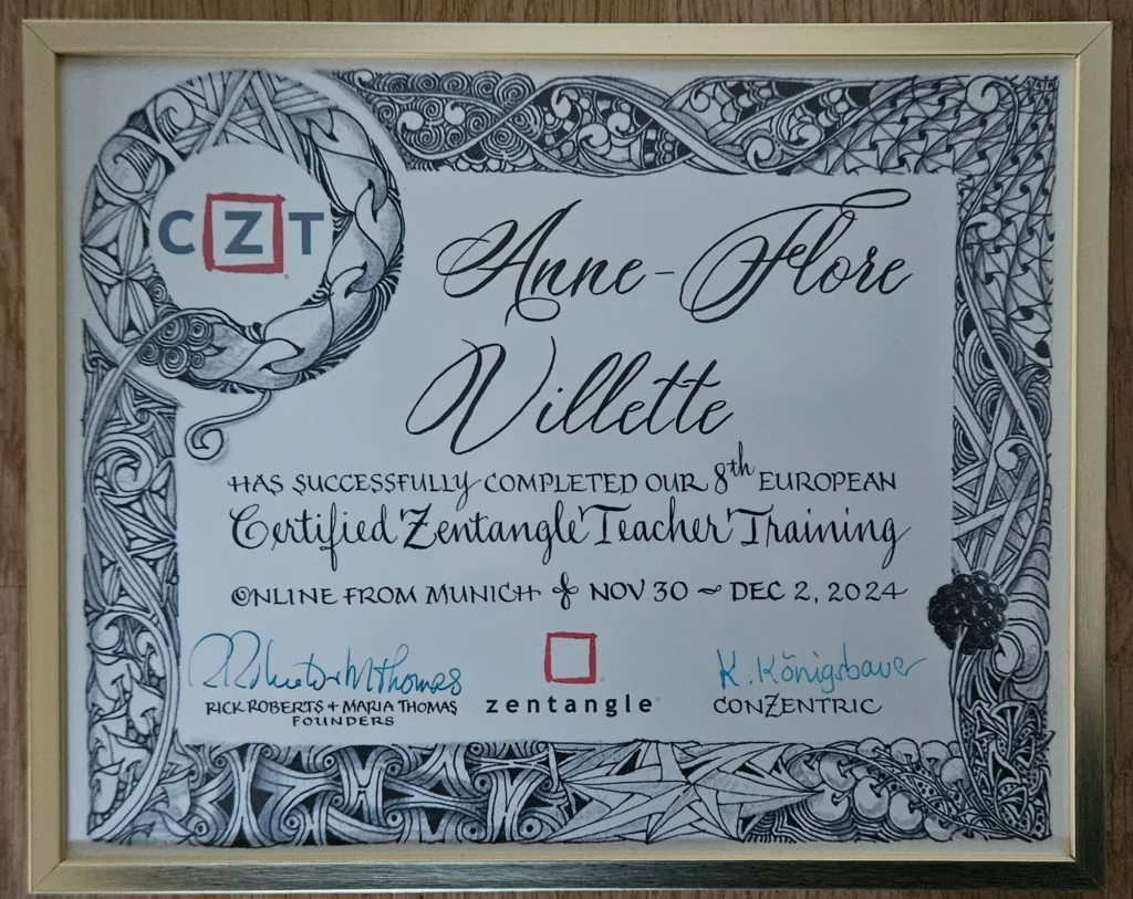 Cette révélation m’a poussée à aller encore plus loin. Pour compléter et enrichir ma certification d’enseignante Zentangle, j’ai choisi de me former et de devenir Praticienne Certifiée en Art-Thérapie et Coach en Psychologie Positive. Ces bagages supplémentaires ne sont pas de simples diplômes ; ce sont des connaissances approfondies et des outils complémentaires qui me permettent de :