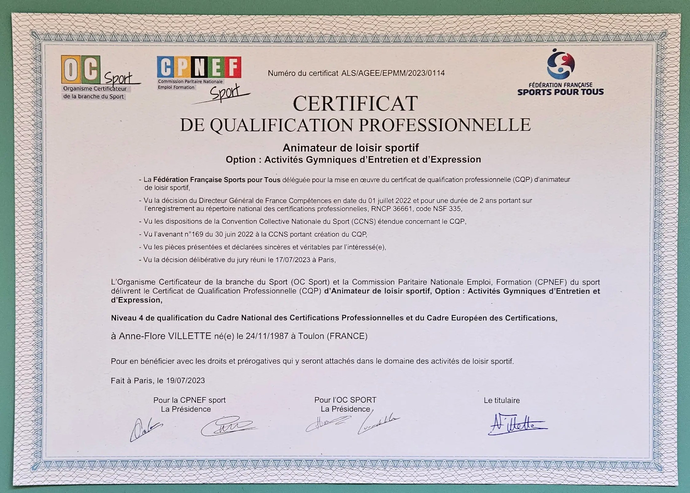 - CQP d’Animatrice de Loisirs Sportifs (option activités gymniques, obtenu en présentiel)